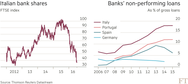 Nel frattempo la banca italiana più internazionale (UniCredit) ha dovuto varare un terzo aumento di capitale. Nomi storici come Carige o Siena aspettano il cavaliere bianco. Meglio se straniero. Circa mezzo milione di risparmiatori sono stati travolti da truffe e fallimenti ad Arezzo, Ancona o Vicenza. Mentre la crisi ha via via acuito le condizioni del mercato del credito, con le sofferenze salite forse a 360 miliardi di euro a giugno 2016.