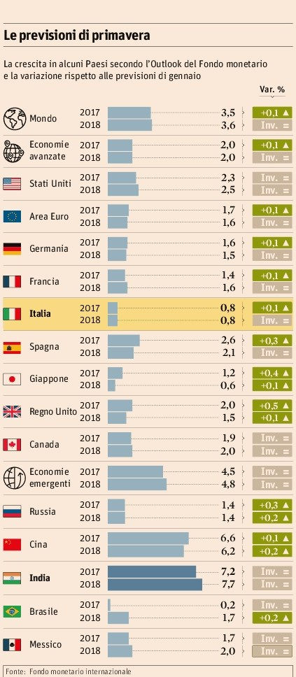 L’Italia non aggancia la ripresa che si sta rafforzando nel resto dell’economia mondiale e la sua crescita resta al di sotto dei maggiori Paesi industriali, secondo le nuove previsioni del Fondo monetario. All’orizzonte globale si profila tuttavia il rischio del protezionismo, sul quale il direttore dell’Fmi, Christine Lagarde, ha già lanciato l’allarme e che è oggetto di polemiche con l’amministrazione Trump. La questione sarà nuovamente al centro di possibili controversie questa settimana alle riunioni del G-20 e dell’Fmi a Washington. Il capo economista del Fondo, Maurice Obstfeld, nel presentare le previsioni, ha sostenuto che il protezionismo e una «corsa al ribasso» nella regolamentazione della finanza (un altro timore riguardo alla nuova linea degli Stati Uniti) «sarebbero peggio per tutti». Le altre preoccupazioni vengono dall’Europa: Obstfeld ha osservato che gli spread in aumento, soprattutto sul debito francese, riflettono le tensioni politiche in vista delle elezioni di domenica, ma non possono tenere interamente conto del rischio di rottura dell’euro, un evento che definisce «cataclismico», ma «improbabile». «Alcuni politici – dice l’economista – hanno una piattaforma elettorale anti-euro, ma da qui alla rottura dell’euro, ci vogliono diversi passi. È importante non esagerare questi rischi». L’economia italiana crescerà dello 0,8% sia quest’anno sia il prossimo, secondo le stime del “World Economic Outlook”, pressoché invariate rispetto a quelle di gennaio. Le cifre dell’Fmi sono in entrambi i casi inferiori a quelle del Governo nel Documento di economia e finanza appena pubblicato, dell’1,1% nel 2017 e dell’1% nel 2018. La crescita italiana è «nettamente al di sotto del potenziale», sostengono gli economisti del Fondo, così come quelle di Francia, Portogallo, Spagna e Grecia. Per Carlo Cottarelli, direttore esecutivo per l’Italia all’Fmi (che ha peraltro annunciato che a ottobre lascerà il Fondo) la priorità italiana deve essere ridurre il debito pubblico «perché mantenerlo stabile ci lascia esposti a potenziali attacchi speculativi». L’area dell’euro crescerà nel suo complesso dell’1,7% quest’anno e dell’1,6% il prossimo. La disoccupazione in Italia scenderà dall’11,7% del 2016 all’11,4% nel 2017 e all’11% nel 2018, ma resterà la più alta nell’Eurozona, con l’eccezione di Spagna e Grecia. Il deficit pubblico italiano, secondo l’Fmi, che non tiene ancora conto del Def e della “manovrina”, sarà del 2,4% nel 2017 e dell’1,4% nel 2018. L’economia mondiale, grazie a miglioramenti del settore manifatturiero e del commercio internazionale, raggiungerà un’espansione del 3,5% nel 2017 e del 3,6% nel 2018 (dopo il 3,1% nel 2016). I mercati finanziari sono ottimisti, rileva l’Fmi, nell’aspettativa di un continuo supporto da parte della politica economica in Cina e di una politica fiscale espansiva e di deregolamentazione negli Usa. Se la fiducia di consumatori e imprese e l’atteggiamento dei mercati resteranno forti, secondo il documento, nel breve periodo la crescita potrebbe sorprendere positivamente. Nei Paesi in cui la crescita è insufficiente, la politica monetaria deve rimanere accomodante (un riferimento alla Banca centrale europea), ma non può fare da sola, secondo il Fondo monetario, che, fra le altre misure di rilancio, sottolinea ancora una volta la necessità di ripulire i bilanci bancari, affrontando il problema dei crediti deteriorati (Npl), un problema particolarmente acuto in Italia, e rafforzando l’efficienza delle banche. «Una priorità cruciale per spingere la crescita e limitare i rischi al ribasso nell’area euro – dice l’Fmi – è di accelerare la riparazione dei bilanci delle banche e la soluzione del problema degli Npl, attraverso una combinazione di maggior incoraggiamento da parte della vigilanza, riforma delle leggi fallimentari e sviluppo di mercati per i debiti in sofferenza». Il completamento dell’unione bancaria, compresa l’introduzione di uno schema comune di assicurazione dei depositi con un efficace sostegno fiscale, è anch’esso cruciale. Queste azioni «faciliterebbero la trasmissione dello stimolo della politica monetaria all’economia reale e promuoverebbero il risanamento del settore bancario». Nel medio periodo, il Fondo monetario ritiene che i rischi per l’economia mondiale restino al ribasso, a causa della bassa crescita della produttività e della forte disuguaglianza dei redditi, che richiedono interventi strutturali. Ma l’Fmi è preoccupato anche, come ha dichiarato recentemente il suo direttore Christine Lagarde, del fatto che politiche protezionistiche possano minacciare l’integrazione economica globale e la cooperazione dell’ordine economico, che hanno portato effetti positivi all’economia mondiale. Il riferimento trasparente è alla minaccia di scelte protezioniste del nuovo Governo Usa. Il segretario al Commercio americano Wilbur Ross ha definito «sciocchezze» gli ammonimenti della signora Lagarde...