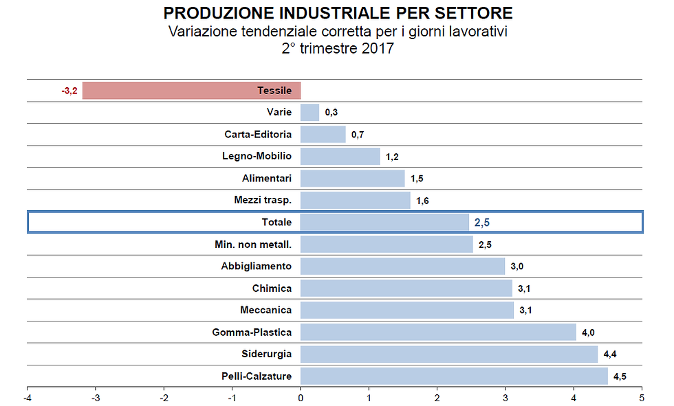 Da un punto di vista settoriale, la dinamica tendenziale della produzione presenta prevalentemente variazioni positive, ad esclusione del settore tessile in contrazione del 3,2%. Tra i settori in crescita spiccano il pelli-calzature (+4,5%), la siderurgia (+4,4%) e la gomma-plastica (+4,0%). Risultati soddisfacenti anche per meccanica e chimica (+3,1% entrambe) e abbigliamento (+3,0%). Seguono i minerali non metalliferi (+2,5%), i mezzi di trasporto (+1,6%), gli alimentari (+1,5%) e il legno-mobilio (+1,2%). Positivi, ma meno dinamici, i settori della carta-stampa (+0,7%) e le industrie varie (+0,3%).
