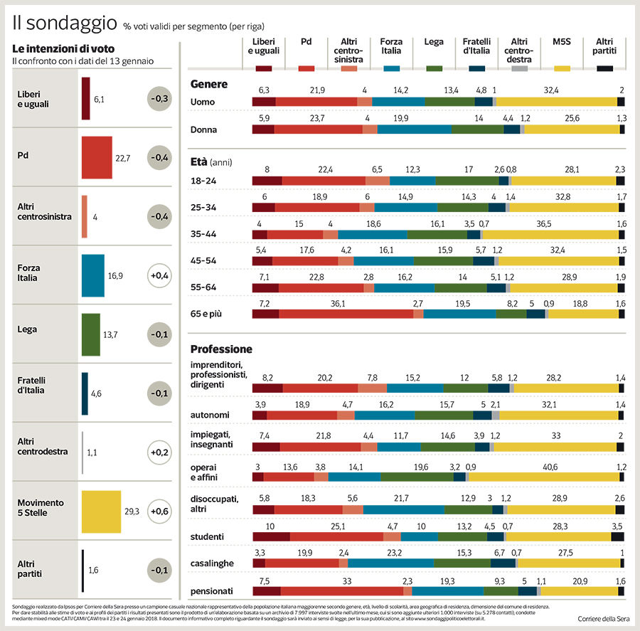 Il risultato più eclatante delle elezioni europee del 2014 non fu tanto il risultato ottenuto dal Pd (40,8% dei voti), quanto l’eccezionale trasversalità del voto: il partito di Renzi si affermò in 105 province su 110 e tra tutti i segmenti sociali con due sole eccezioni, i lavoratori autonomi e gli elettori di età compresa tra 35 e 44 anni (tra i quali il M5S risultò il primo partito). I dem si imposero tra i più giovani come tra gli anziani, tra gli imprenditori come tra i disoccupati, tra i laureati come tra gli analfabeti, tra i cattolici come tra gli atei: l’ultimo voto espresso su scala nazionale, insomma, ancorché segnato da una elevata quota di astenuti (41,3%) fece registrare la trasformazione del Pd in «partito pigliatutti». Oggi lo scenario è profondamente mutato, si sono verificate scissioni e aggregazioni tra partiti e, con la nuova legge elettorale, si sono costituite nuove coalizioni. Così i singoli segmenti sociali presentano una graduatoria e preferenze tra i partiti molto più variegate rispetto a quattro anni fa. Vediamone alcuni. Le donne oggi sono nettamente più indecise e manifestano una maggiore disaffezione rispetto agli uomini (42% contro 27%), sono più inclini a votare per Forza Italia e meno per il M5s. Gli elettori più giovani (18-24 anni) sono spesso oggetto di attenzione da parte dei partiti e dei media: per la maggior parte di loro si tratta delle prime elezioni politiche. Sono poco numerosi (all’incirca l’8% degli elettori) e, come i loro coetanei europei, non sembrano molto mobilitati (il 37,4% si dichiara indeciso o astensionista); il voto per i due principali partiti (M5S e Pd) è sostanzialmente in linea con la media nazionale e sono più propensi a votare per Liberi e uguali, i partiti minori del centrosinistra e Lega. Tra i 25 e i 54 anni l’astensione scende, i dem ottengono meno voti (tra il 15% e il 18,9%), al contrario dei pentastellati che risultano stabilmente sopra il 30%. Tra gli elettori meno giovani (65 anni e oltre), il segmento più numeroso con il 26,4% del totale, indecisione ed astensione toccano il 39% e i partiti preferiti risultano Pd (36,1%) e FI (19,5%), mentre M5s e Lega raggiungono il valore più basso. Riguardo al livello di istruzione si è tornati alle dinamiche tradizionali: i laureati presentano un tasso di astensione più contenuto, una maggiore propensione per la sinistra e il centrosinistra e un consenso decisamente più contenuto per Forza Italia e Lega. Tra le persone meno istruite (con licenza elementare o nessun titolo di studio), che rappresentano un elettore su quattro, il Pd si attesta al primo posto sfiorando il 30% dei voti validi, confermando la tradizionale «doppia anima» del proprio elettorato, seguito dal M5S (24%) che risulta incalzato da FI (22,7%). Anche l’analisi per ceti professionali mostra dati interessanti: tra operai e lavoratori esecutivi il M5S ottiene il consenso più elevato superando il 40%, la Lega vanta un risultato superiore alla media sfiorando il 20%, mentre Pd e sinistra sono in sofferenza. I ceti dirigenti esprimono propensioni al voto abbastanza in linea con la media degli elettori con l’eccezione di Leu e dei partiti minori di centrosinistra (tra cui + Europa di Emma Bonino) che risultano più graditi, mentre il Pd pur confermandosi secondo partito ottiene meno consenso. I cedi medi (impiegati e insegnanti) propendono nettamente per il M5S come pure i lavoratori autonomi (artigiani e commercianti): tra i primi FI è in difficoltà, tra i secondi la Lega ottiene un buon risultato. Tra le casalinghe il M5s è il primo partito, in linea con il dato complessivo, ma si distinguono in positivo Forza Italia (secondo) e Fratelli d’Italia (unico partito con una leader donna). Tra i pensionati Pd e FI sono decisamente sopra la media mentre M5s e Lega sotto. Gli studenti privilegiano Pd e Leu, mentre è più contenuto il consenso per FI e quello per Lega e M5S è in linea con la media generale. Infine i cattolici, un elettorato sempre inseguito dalla politica ma, da tempo, assai poco incline a riconoscersi in uno specifico partito: infatti tra coloro che partecipano assiduamente alla messa domenicale il Pd risulta primo partito, seguito dal M5S che precede di qualche decimale FI. La Lega, presso i cattolici praticanti, ha un consenso più contenuto rispetto alla media. In buona sostanza i partiti tendono ad avere alcuni blocchi sociali di riferimento, le cosiddette costituencies, che esprimono bisogni, priorità, aspettative e valori talora molto diversi. La componente prevalente tra i pentastellati è costituita da coloro che lavorano e appartengono al ceto medio impiegatizio e ai ceti esecutivi; il Pd ha il suo zoccolo duro tra i pensionati; Forza Italia tra le casalinghe e i pensionati (non a caso Berlusconi ha ipotizzato di istituire un ministero per la terza età) mentre, rispetto al passato, ha perso la propria capacità di rappresentanza dei ceti produttivi. La Lega compete con il M5S rappresentando prevalentemente ceti medi e operai. Liberi e uguali ritrova alcune componenti tradizionali della sinistra (pensionati, impiegati e studenti) e, sorprendentemente, gli elettori dei ceti dirigenti sono più numerosi di quelli operai. Il sondaggio odierno fa registrare piccole variazioni per i singoli partiti rispetto a dieci giorni fa (il M5S sale al 29,3%, il Pd scende al 22,7%, mentre Forza Italia è in crescita: 16,9% contro il 13,7% della Lega). Nella fase finale della campagna l’attenzione sarà rivolta prevalentemente all’elettorato più contendibile, rappresentato dall’«area grigia» dell’astensione (21,9%) e dell’indecisione (12,9%) che nell’insieme riguarda oltre un terzo dell’elettorato (34,8%), composto prevalentemente da donne, da elettori meno giovani, poco scolarizzati, casalinghe e pensionati. Poco più della metà di costoro (51,9%) già si astenne nel 2013. Escludendo costoro, tra gli attuali indecisi il segmento più numeroso è di p