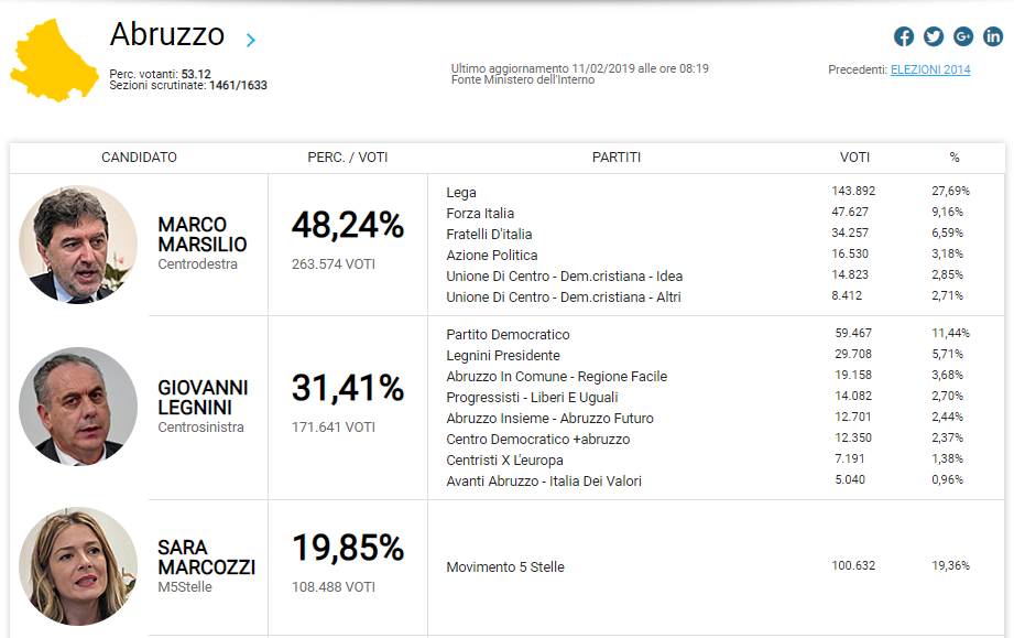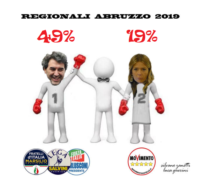 Confermati i sondaggi elettorali, Marsilio vince con la coalizione di centro destra grazie al demiurgo Salvini che oltre a raccogliere i voti dei moderati e conservatori cattura anche gli elettori che per la prima volta avevano votato il so alleato di governo.